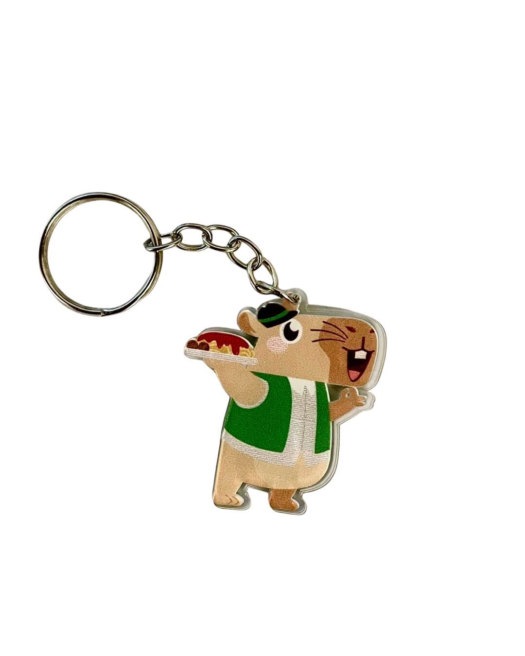 ピザを手にしたカピバラが、陽気に笑顔を見せるデザインのアクリルキーホルダーです。
