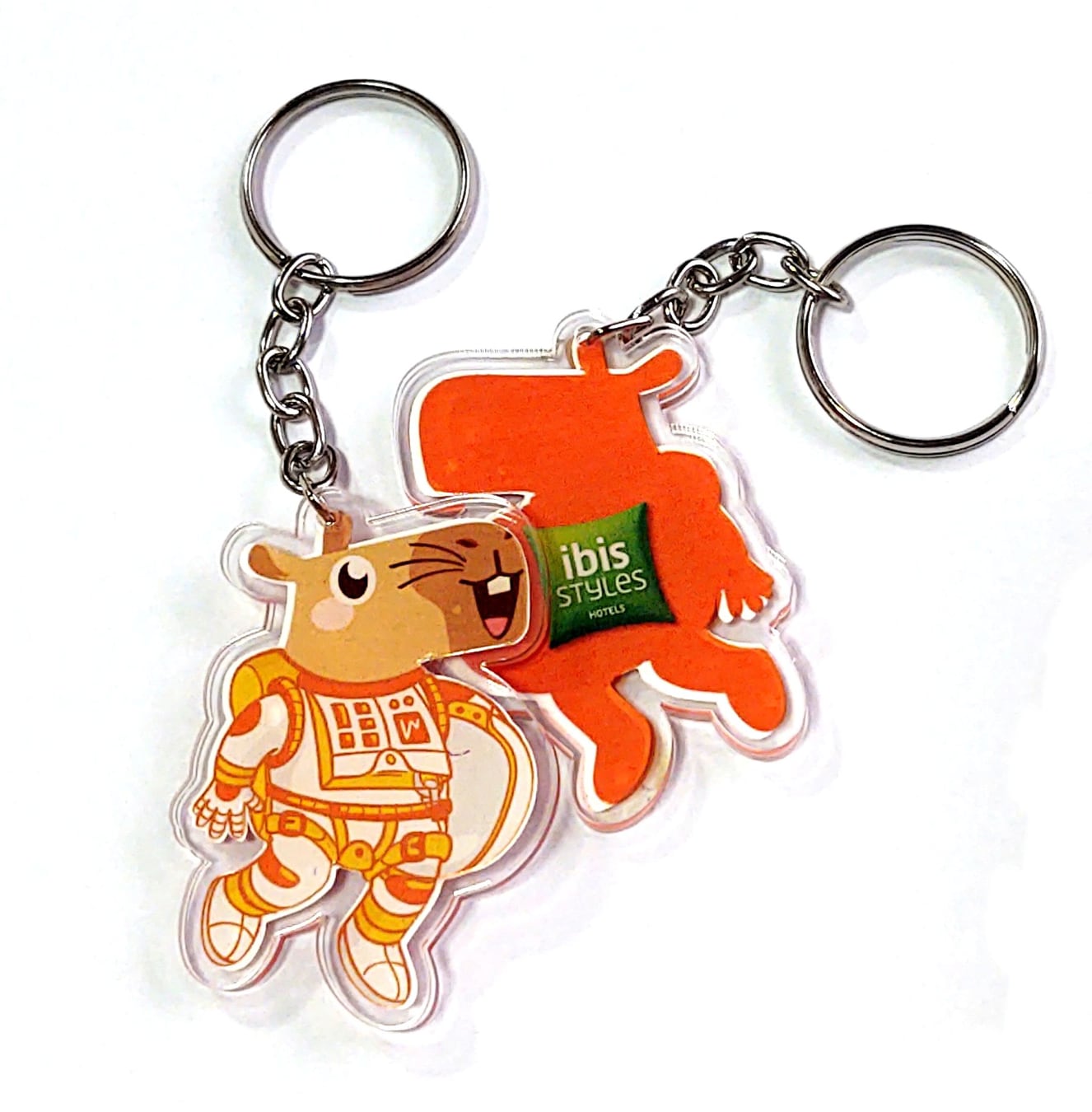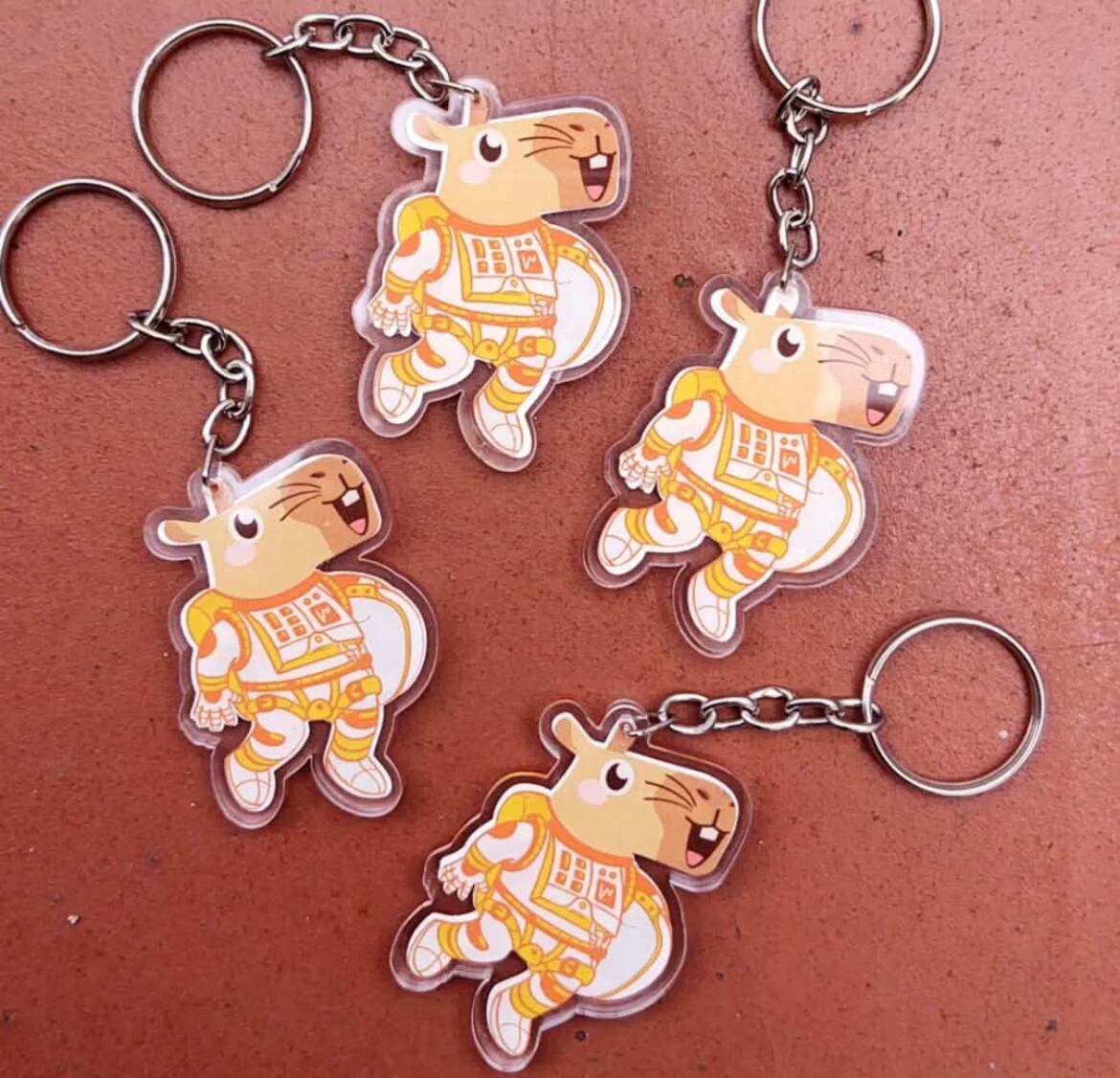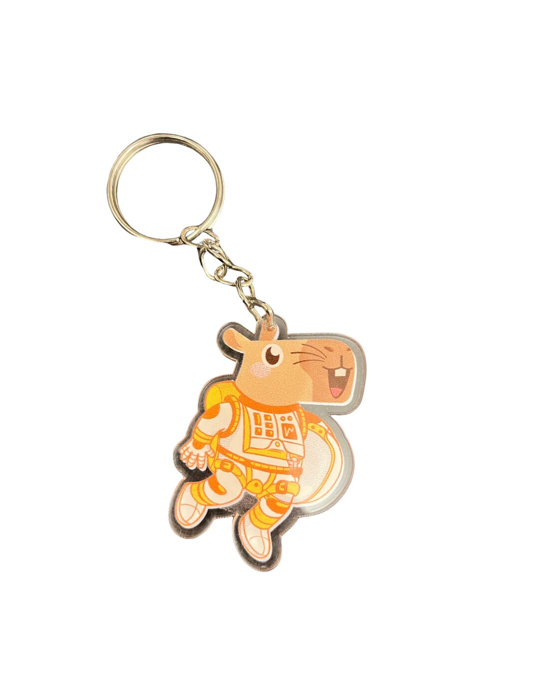 宇宙服を着たカピバラがにっこり笑う、遊び心あふれるアクリルキーホルダーです。
