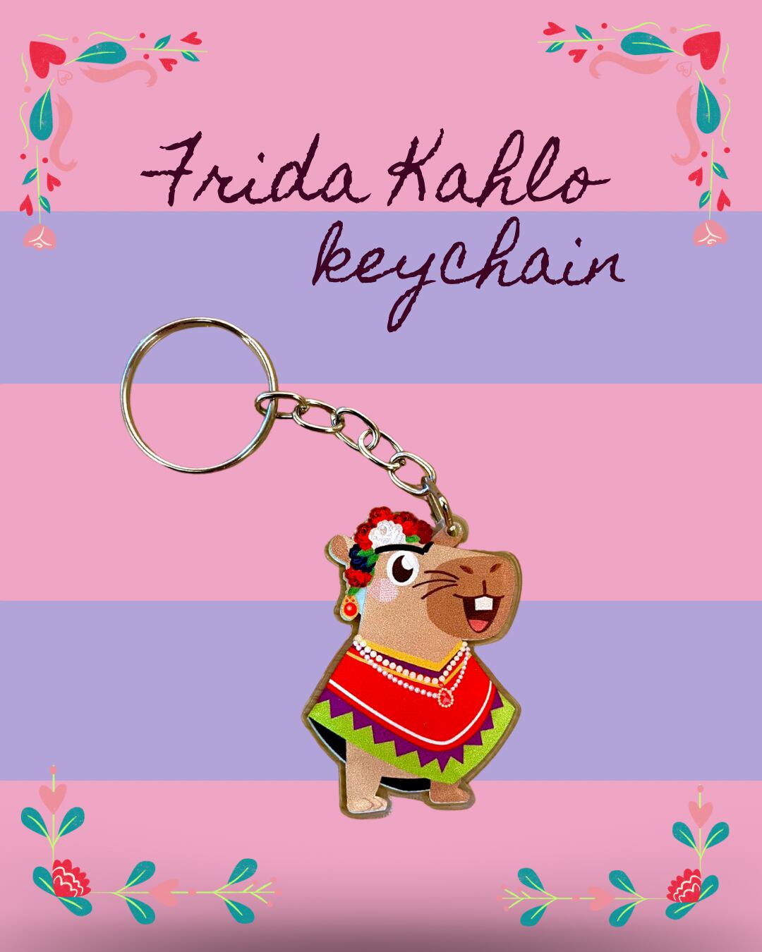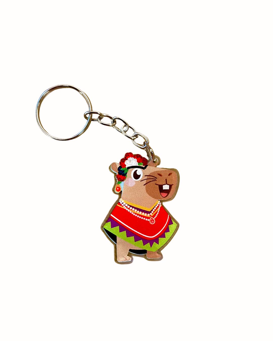 メキシコの芸術家フリーダ・カーロをモチーフにした、華やかで力強い印象のカピバラが描かれたアクリルキーホルダーです。
