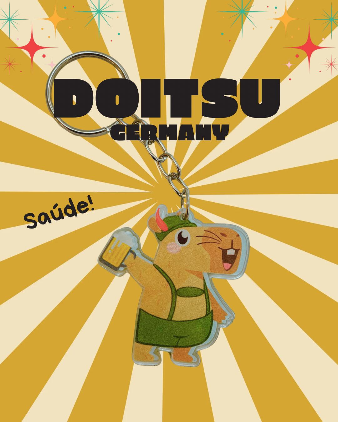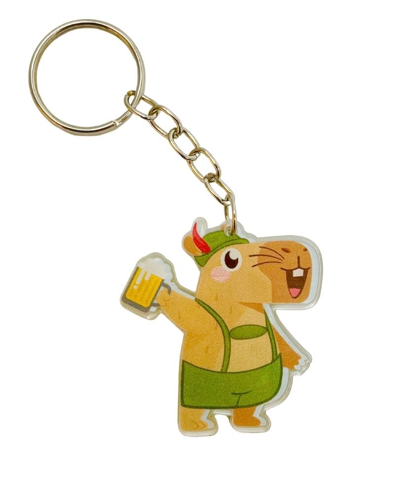 ビールジョッキを掲げる陽気なカピバラが描かれた、ドイツをイメージしたアクリルキーホルダーです。