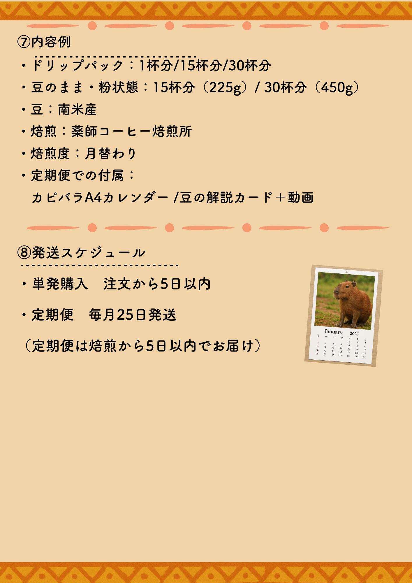 本商品は、薬師コーヒー焙煎所とのコラボレーションで生まれた、毎月異なる味と焙煎度を楽しめる 特別仕様のカピバラブレンド・スペシャリティコーヒー です。