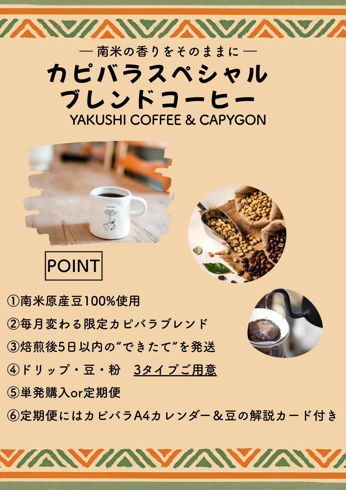 「焙煎したての鮮度」 × 「毎月変わる限定ブレンド」 × 「学べるコンテンツ」 × 「南米カピバラの世界観」