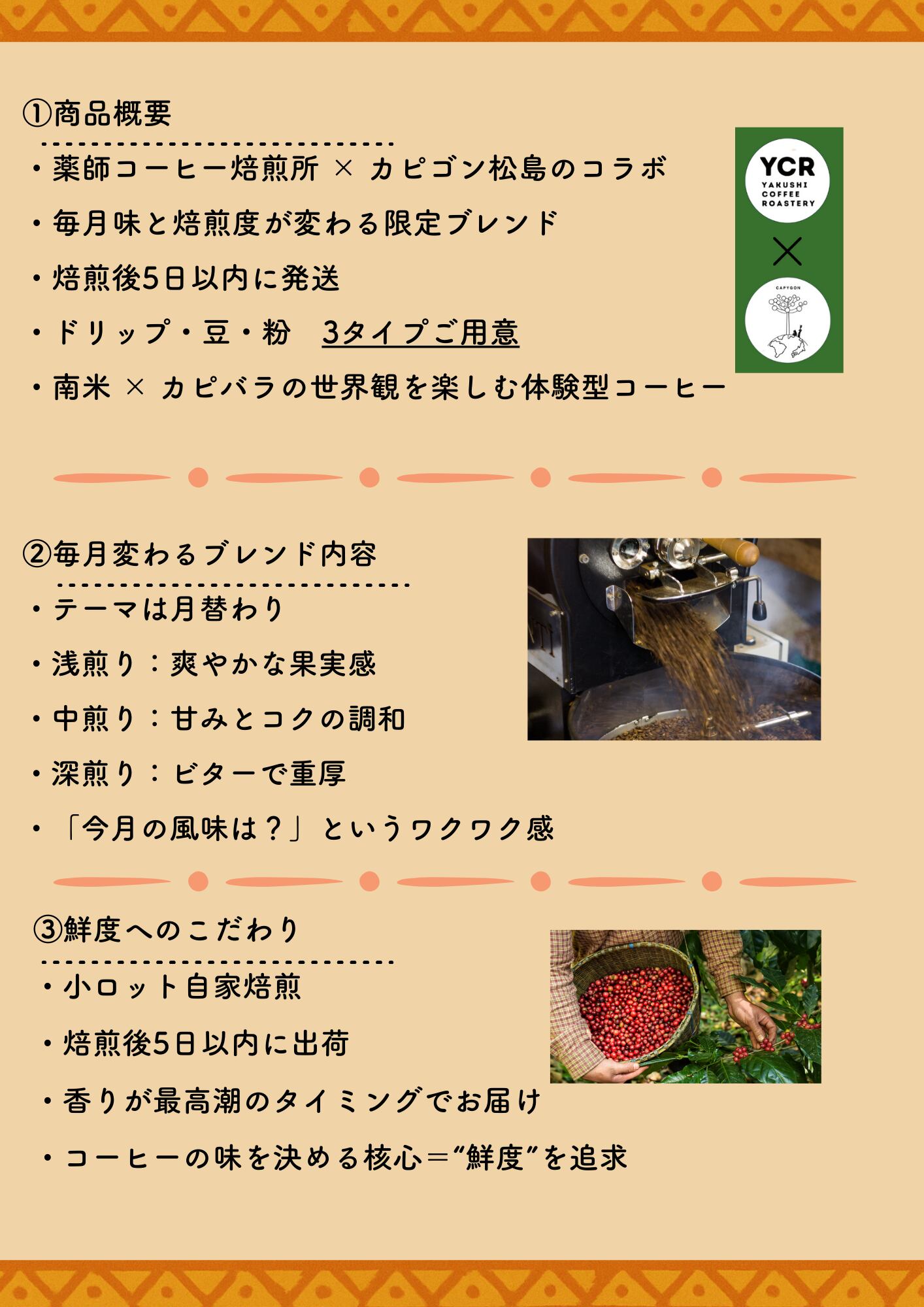 「焙煎したての鮮度」 × 「毎月変わる限定ブレンド」 × 「学べるコンテンツ」 × 「南米カピバラの世界観」
