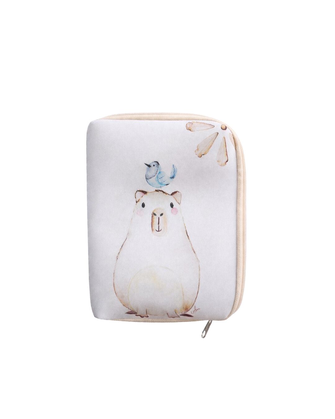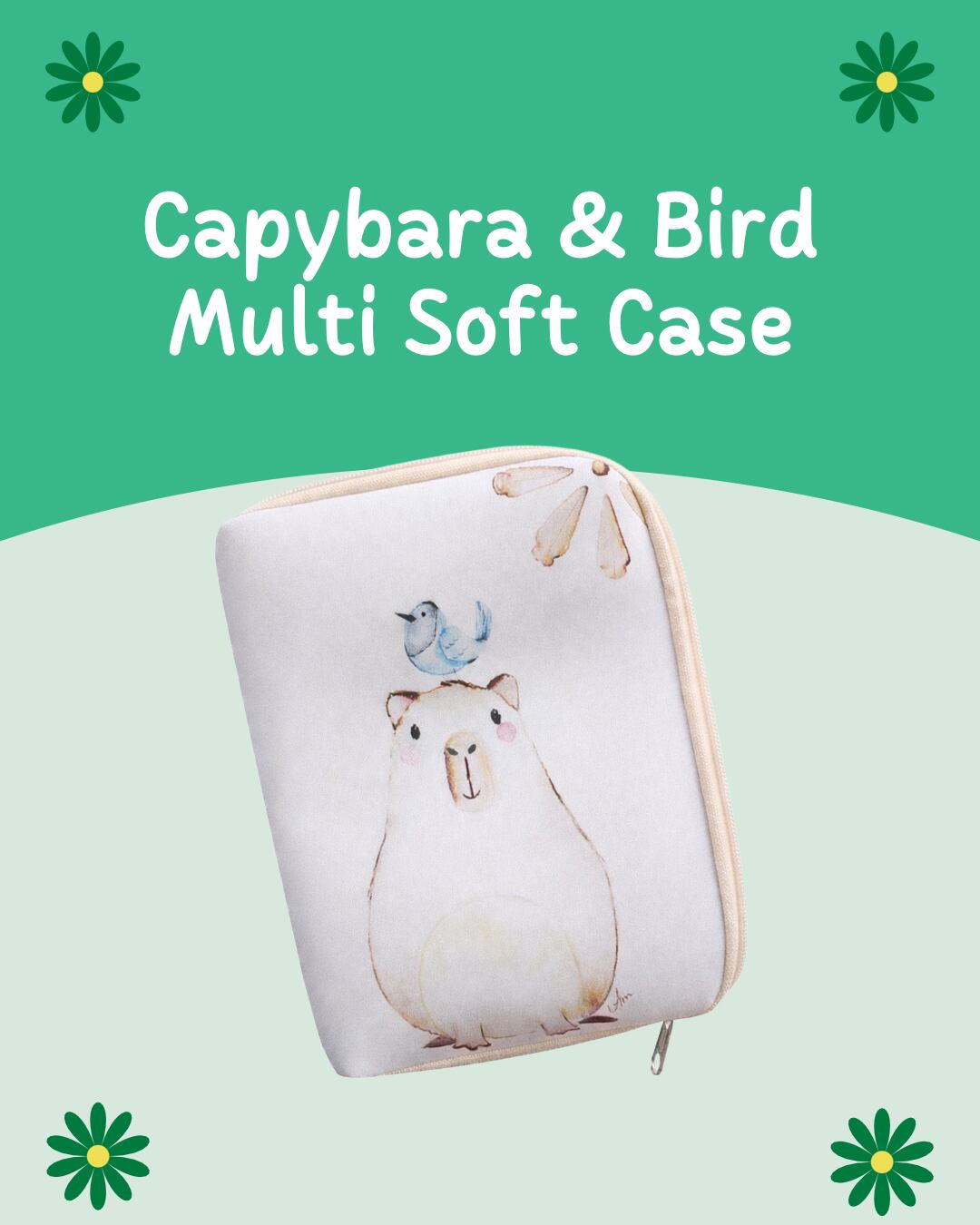 水彩画風に描かれた青い小鳥とカピバラが特徴の、愛らしいマルチソフトケースです。背景は優しい色合いの水彩タッチで、穏やかな自然の雰囲気を醸し出しています。カピバラと小鳥の可愛らしい姿が、日常を彩る一枚です。