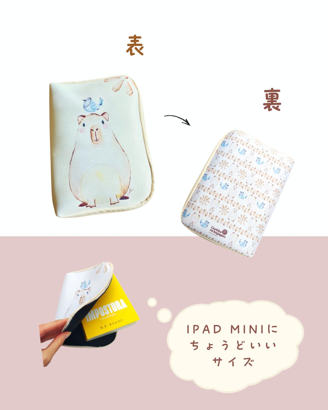 こちらは、青い小鳥と水彩カピバラのデザインが目を引く、マルチソフトケースです。柔らかな曲線で描かれたカピバラが、どこか心を和ませる存在感を放ちます。軽量でしなやかな素材を使用しており、持ち運びやすさと保護機能を兼ね備えています。iPad miniにぴったりフィットし、あなたの大切なデバイスをしっかりと守ります。