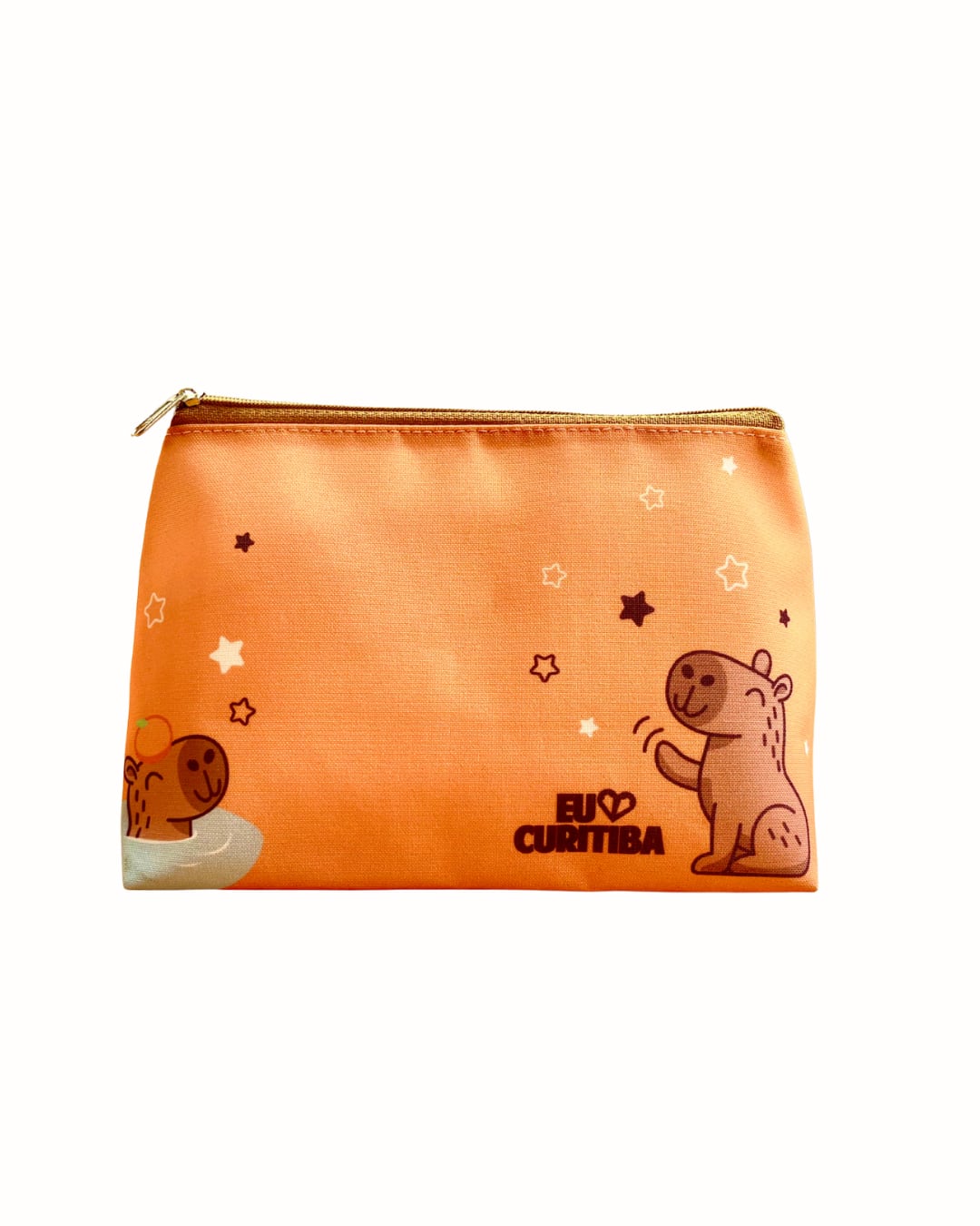 ニコニコと笑顔を浮かべるカピバラが描かれたおしゃれなポーチです。ブラジル・クリチバの魅力を感じさせる、やさしい色合いのデザインが特徴で、楽しげな雰囲気を演出します。実用性と可愛らしさが融合した一品で、普段使いにもお出かけ時にもぴったりです。